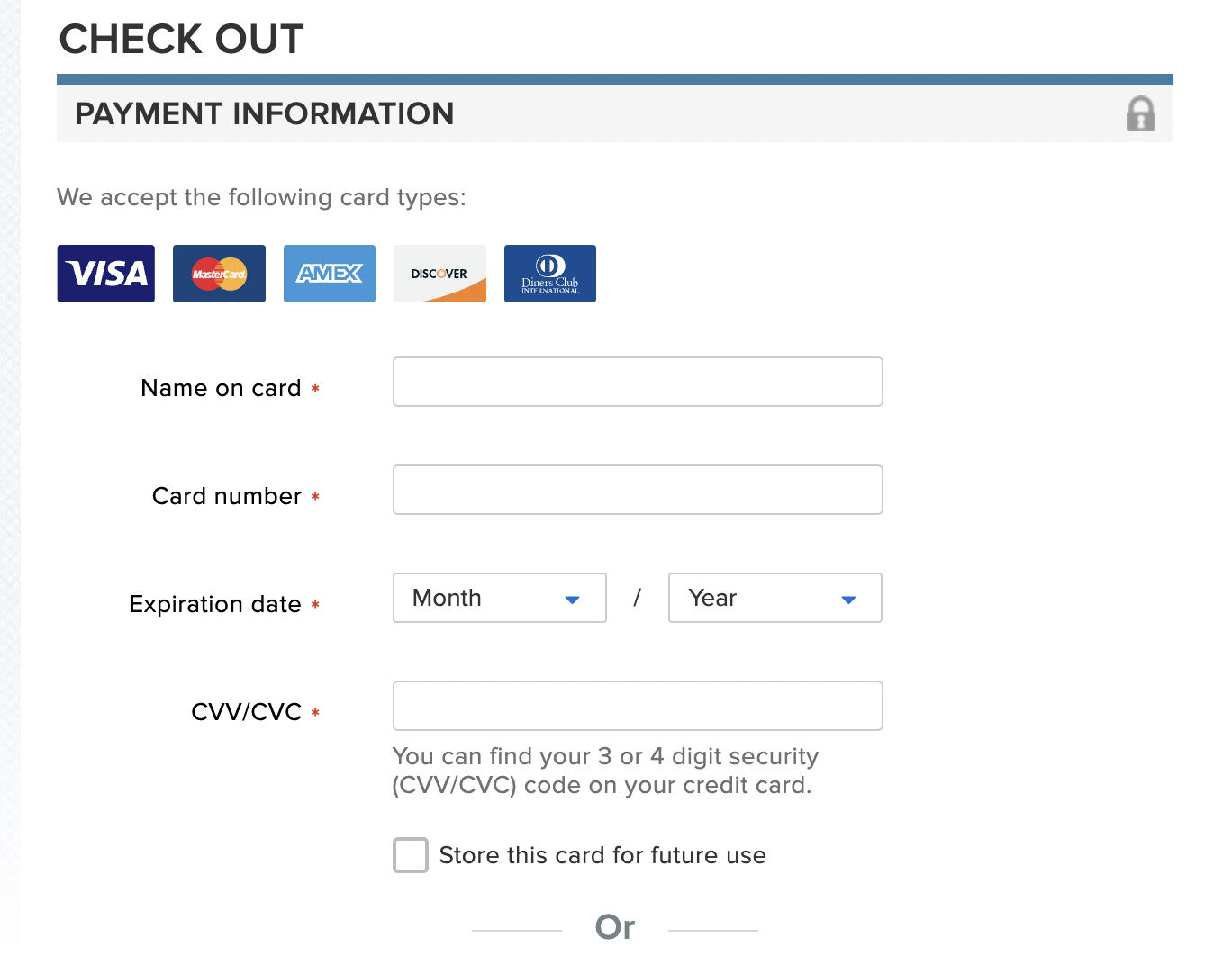 You can save a credit card to your account during the checkout process. There isn't a way to add a card outside of registration, but once saved, it stays on file for future transactions.